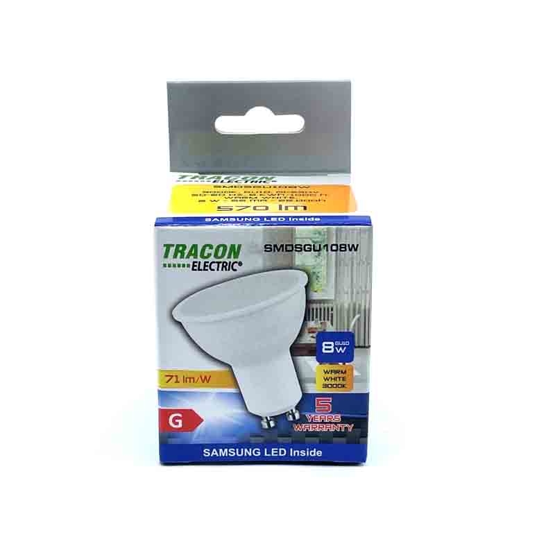 LED teplá SMD žárovka s plastovým tělem s jmenovitým napětím 230 V a výkonem 8 W. Použitelná v domácnostech, kancelářích. Není použitelná se stmívačem.