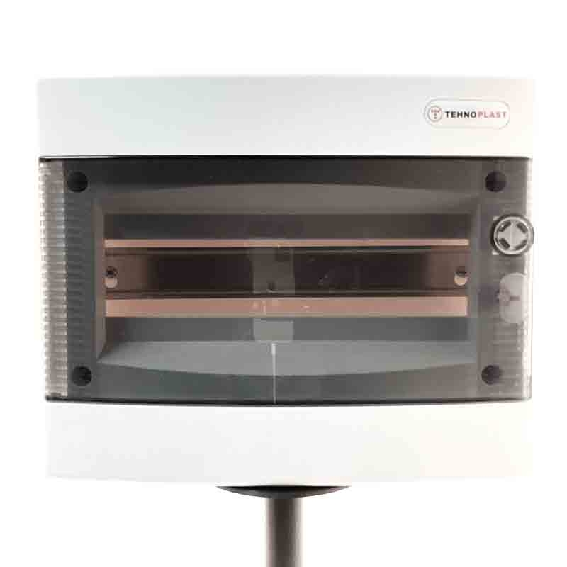 Bílá rozvodnice pod omítku s průhlednými dvířky. Zobrazit více