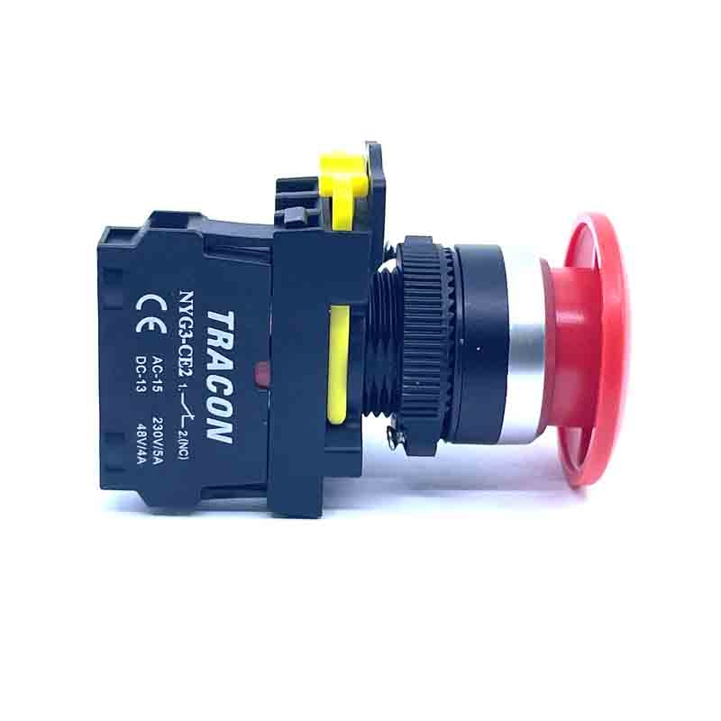Hřibové červené tlačítko odolné proti vibracím s kontakty 1xNC (rozpínací), jmenovitým napětím 230V a jmenovitým proudem 5A.