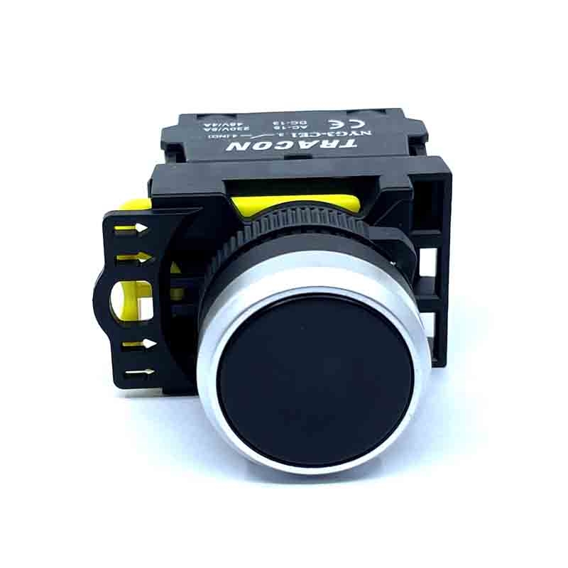 Klasické černoé tlačítko odolné proti vibracím s kontakty 1xNO (spínací), jmenovitým napětím 230V a jmenovitým proudem 5A.