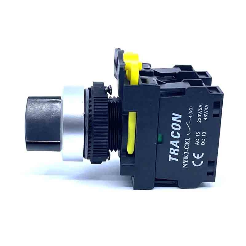 Otočný spínač s páčkou 2-polohový s pružinovým návratem odolný proti vibracím s kontakty 1×NO+1×NC, jmenovitým napětím 230V a jmenovitým proudem 5A.