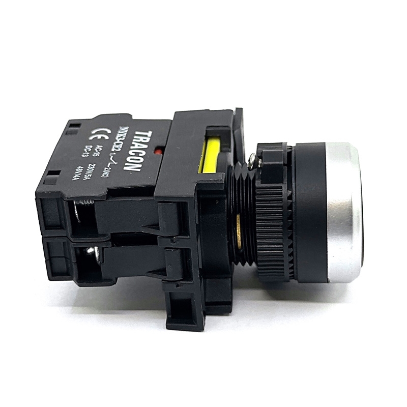 Podsvícený tlačítkový spínač odolný proti vibracím s kontakty 1xNO (spínací), jmenovitým napětím 230V a jmenovitým proudem 5A.