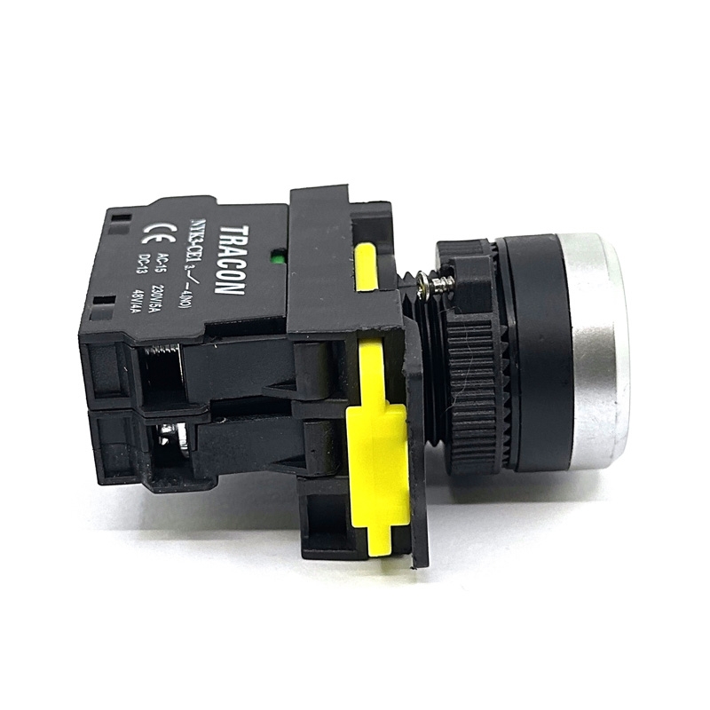Podsvícený tlačítkový spínač odolný proti vibracím s kontakty 1xNO (spínací), jmenovitým napětím 230V a jmenovitým proudem 5A.