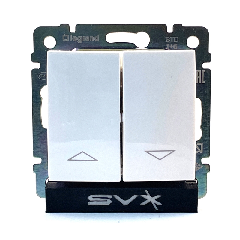 Bílý Valena žaluziový vypínač, který je základní součástí série Valena. Prodává se bez rámečku - ten je potřeba dokoupit. Tento vypínač má jmenovitý proud 10 A a napětí 250 V.
