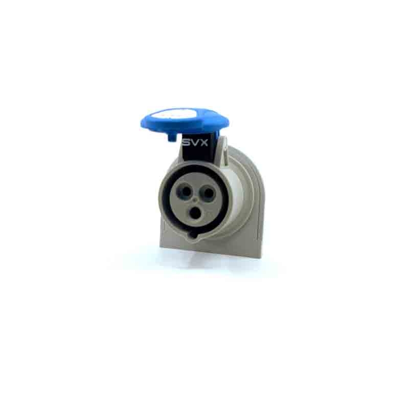 Průmyslová nástěnná zásuvka značky SEZ. Tyto zásuvky a vidlice jsou určeny pro připojování elektrických zařízení a spotřebičů na nízké napětí. Jednou z výhod tohoto spojení je možnost opakovaného rozpojení obvodu s vysokou pevností a odolností.