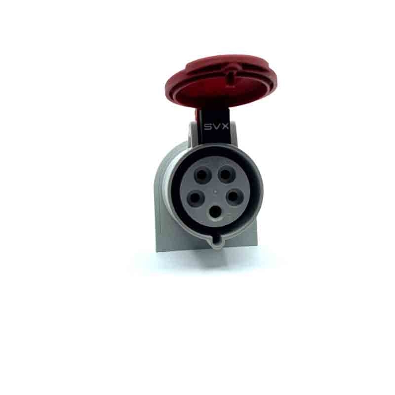 Průmyslová nástěnná zásuvka značky SEZ. Tyto zásuvky a vidlice jsou určeny pro připojování elektrických zařízení a spotřebičů na nízké napětí. Jednou z výhod tohoto spojení je možnost opakovaného rozpojení obvodu s vysokou pevností a odolností.