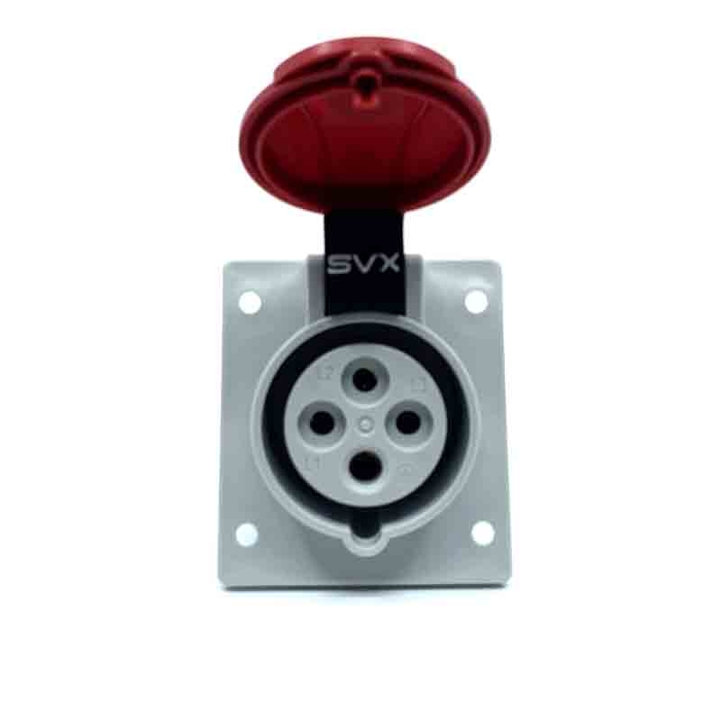 Průmyslová vestavná zásuvka značky SEZ. Tyto zásuvky a vidlice jsou určeny pro připojování elektrických zařízení a spotřebičů na nízké napětí. Jednou z výhod tohoto spojení je možnost opakovaného rozpojení obvodu s vysokou pevností a odolností.