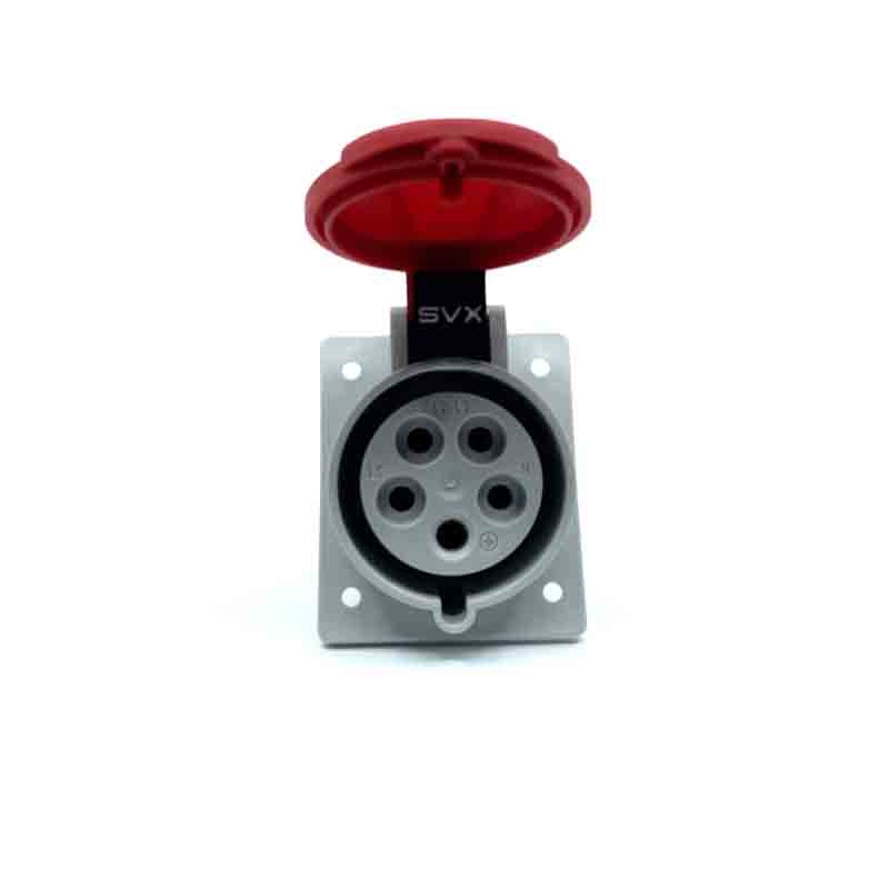 Průmyslová vestavná zásuvka značky SEZ. Tyto zásuvky a vidlice jsou určeny pro připojování elektrických zařízení a spotřebičů na nízké napětí. Jednou z výhod tohoto spojení je možnost opakovaného rozpojení obvodu s vysokou pevností a odolností.