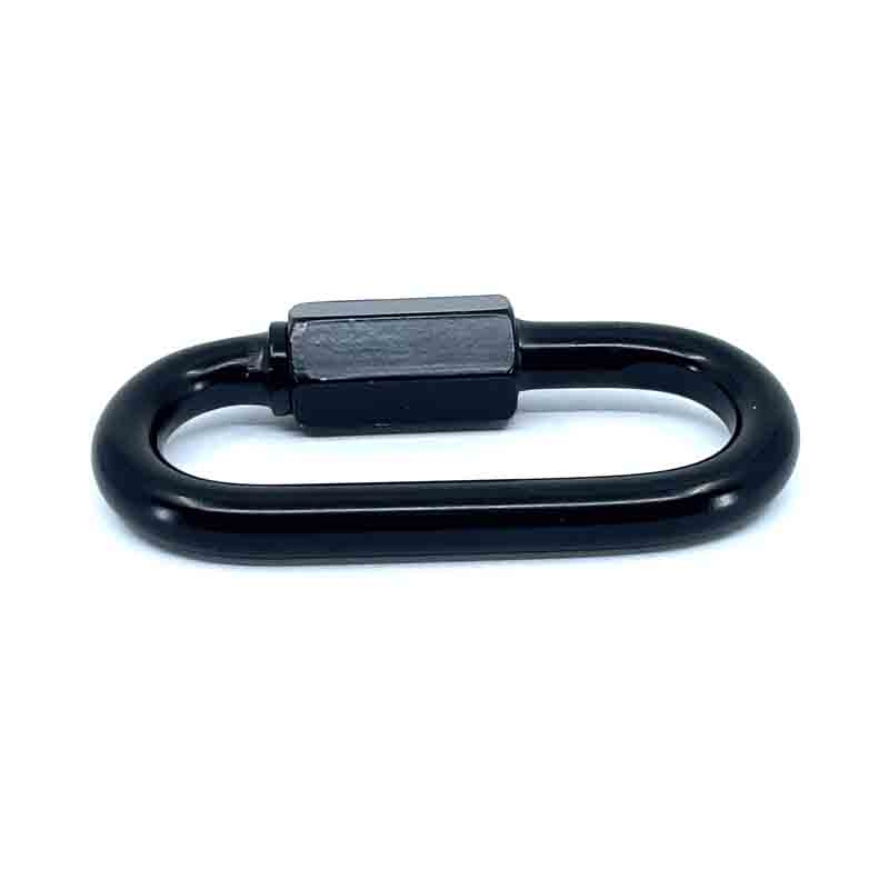 Černá karabina s maticí je vhodná ke spojení řetězových článků a zavěšení lehkých břemen.