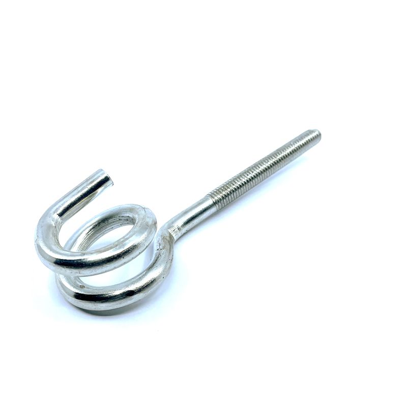 Dvojitý houpačkový hák s metrickým závitem a pozinkovaným povrchem. Tento hák se závitem a se zakrouceným okem umožňuje bezpečné zavěšení houpačky pomocí matice a podložky, kdy je možné zavěšení nad nosný trám.