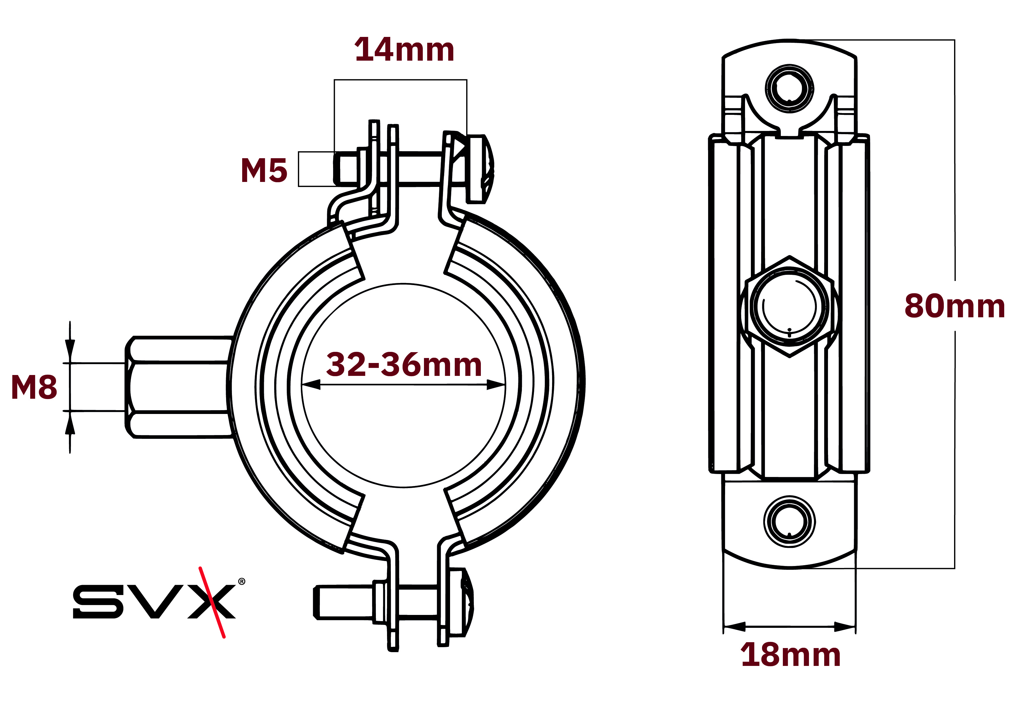- Díky dvěma upínacím šroubům lze průměr a sílu sevření objímky jednoduše přizpůsobit skutečnému vnějšímu průměru potrubí.