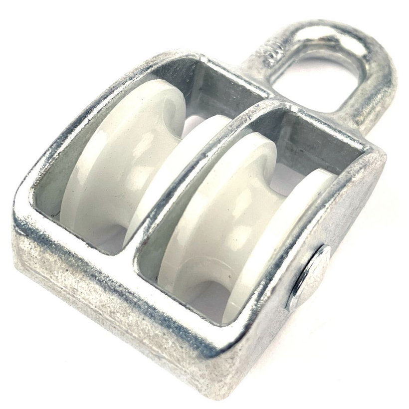 Kladka dvoukolečková pevná se silonovými kolečky je pozinkovaná. Ocelová kladka je s okem a dvěma cívkami. Cívky jsou vyrobeny z nylonu.