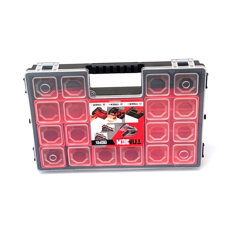 - Průhledný kryt, díky kterému rychle a jednoduše naleznete co potřebujete, bez nutnosti otevření organizéru.
