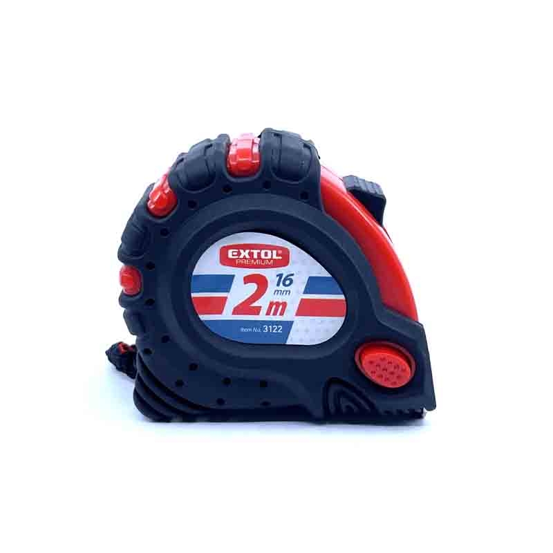 Svinovací pogumovaný metr s magnetem je 2 metry dlouhý, 16 milimetrů široký a má 3 brzdy. Pogumované pouzdro a běžec nám poslouží pro lepší úchop a odolnost. Tři brzdy umožňují pohodlně krátkodobě zabrzdit pás. Metr disponuje kovovým klipem, díký kterému metr zavěsíme za opasek. Metr má samonavíjecí mechanismus, který je vybavený spolehlivou a silnou pružinou.