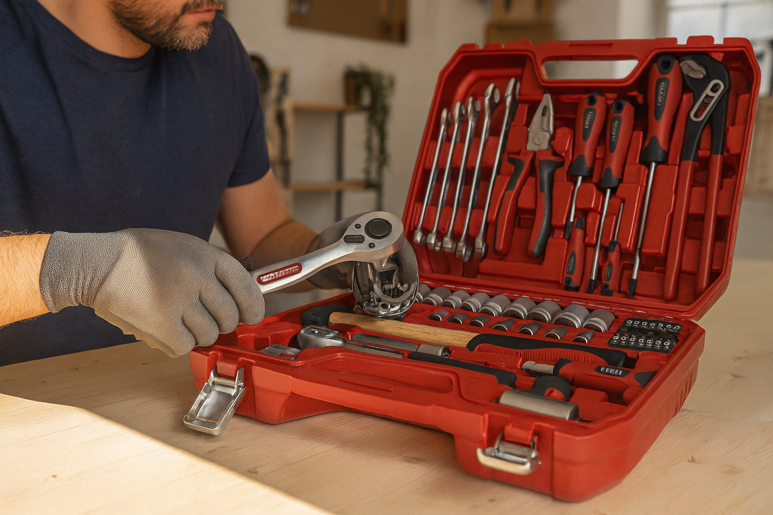 Komplexní 55dílná sada pro domácí dílnu, servis i montáže. Kvalitní chrom-vanadiová ocel (Cr-V) zaručuje vysokou odolnost a dlouhou životnost nástrojů. Vše je přehledně uloženo v pevném kufru, takže máte potřebné nářadí vždy po ruce – od šroubování a drobných oprav až po montáž nábytku či údržbu v domácnosti.