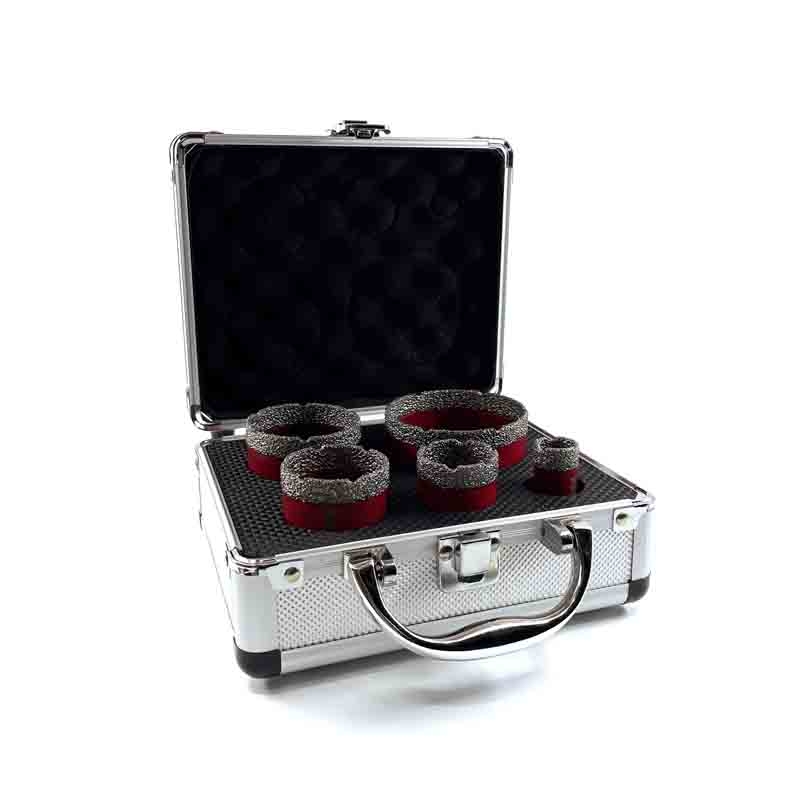 Vyřezávací sada diamantových vrtáků DCB11 - 20 - 35 - 45 - 55 - 72 mm / M14 - v praktickém kufříku. Tyto vrtáky zaručují rychlost vrtání do nejtvrdších materiálů. Boční průduchy urychlují vrtání a odstraňování materiálu.