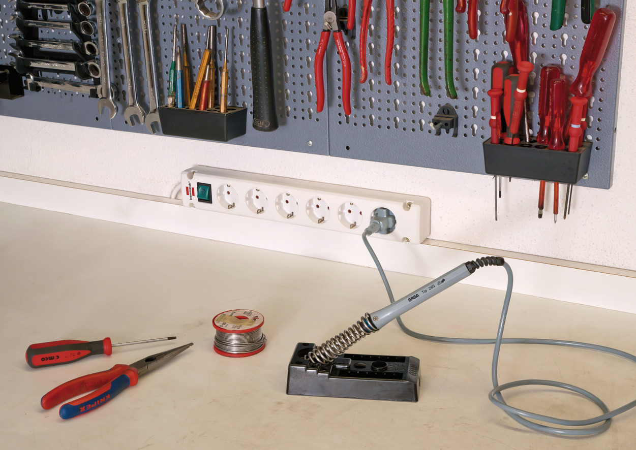 Estetická a praktická zásuvková lišta bez kabelu je ideální všude tam, kde chcete mít pevně umístěné napájení – například na stěně v dílně, garáži, kanceláři nebo v technické místnosti. Díky montážním okům ji jednoduše připevníte pomocí šroubů. Zásuvky jsou uspořádány pod úhlem 90° a mají větší rozestupy, takže pohodlně připojíte i nabíječky nebo úhlové zástrčky. Ovládání zajišťuje praktický vypínač Zap/Vyp.
