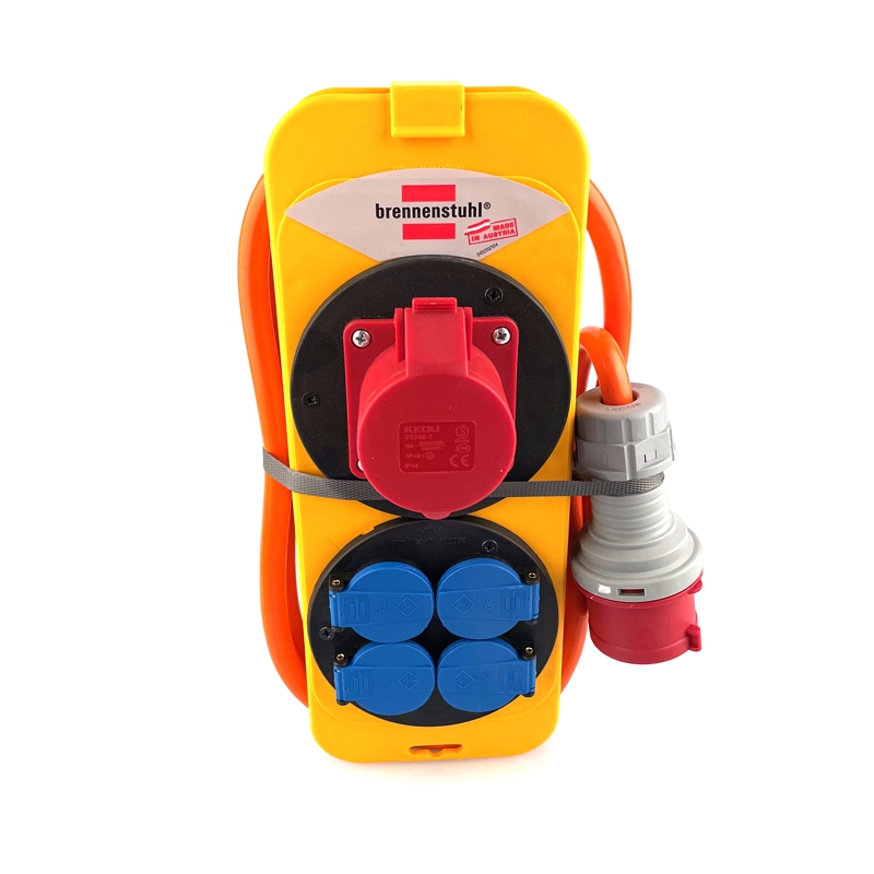 Elektrický rozvaděč s CEE zástrčkou, 5-pólový, 400 V/16 A. Obsahuje 4 zásuvky 230 V se samozavíracími ochrannými víčky (IP44) a jednu CEE zásuvku 400 V/16 A. Vhodný pro venkovní použití.
