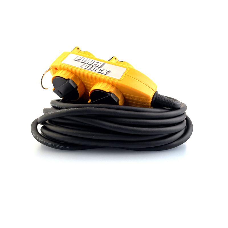 Ideální pro tvrdé nasazení na staveništích, v dílnách a v oblasti průmyslu. Kvalitní zásuvkový blok odolný proti nárazu a rozbití má 4 zásuvky pootočené o 45 ° .Chránený proti stříkající vodě je se samozavíracími ochrannými víčky. Se sklopným kovovým hákem.