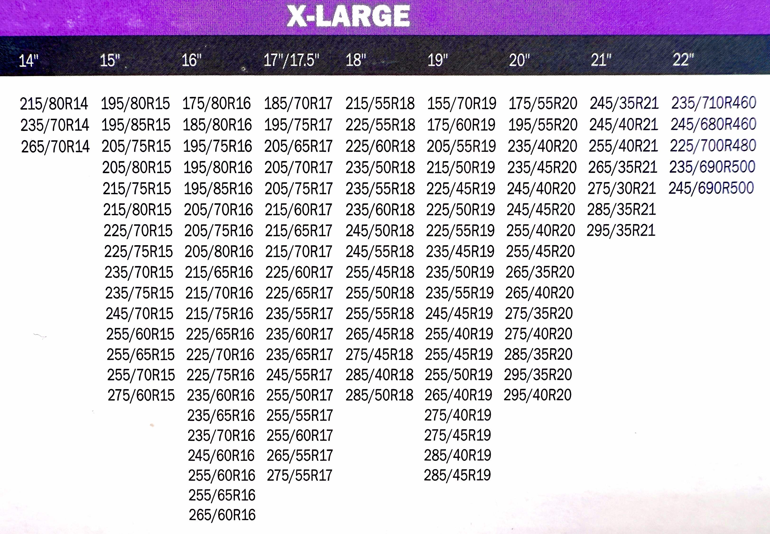 - Pro správný výběr velikosti použijte tabulku aplikací podle rozměru pneumatiky (velikosti XS–XXL).