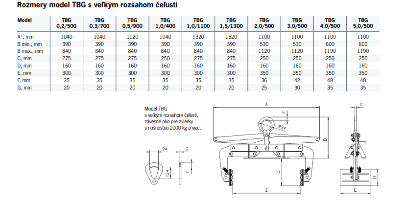 Svěrka pro přepravu kamenných bloků s velkým rozsahem čelistí TBG 1,0/400